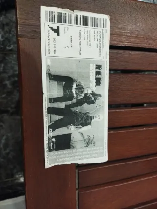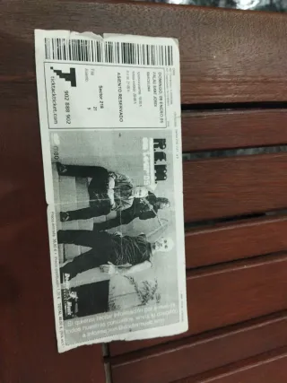 Entrada para el concierto de R.E.M. en el Palau Sant Jordi. - Fecha: Domingo, 09 de enero de 2005. - Lugar: Palau Sant Jordi, Barcelona. - Sector: 218. - Asiento: 21, 9. - Apertura de puertas: 18:00h. - Artista invitado: 20:00h. - Concierto R.E.M.: 21:00h.