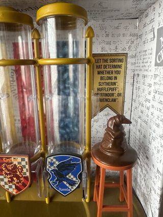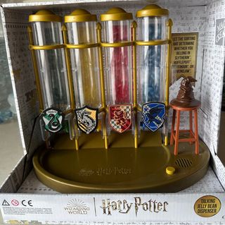 Dispensador de caramelos temático de Harry Potter, con los escudos de las cuatro casas de Hogwarts. - Diseño inspirado en el mundo mágico. - Incluye un sombrero seleccionador. - Producto oficial de Harry Potter.