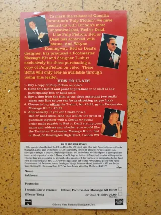 Flyer publicitario de oferta exclusiva para adquirir una camiseta y un kit de masaje (The Footmaster). Se incluía en la cinta original de vhs. 17,50 × 9,50 cms. ENVÍO EN 24H.