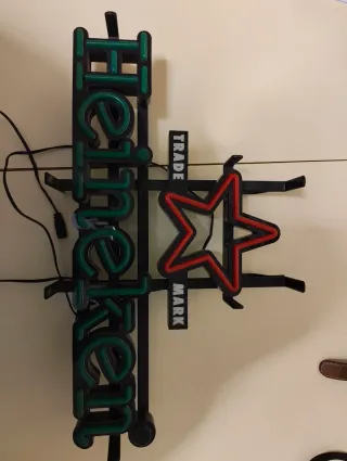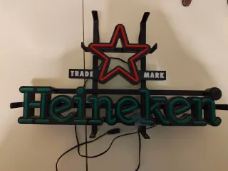 Cartel luminoso de la marca Heineken con su icónica estrella roja. - Diseño con letras verdes. - Marco negro. - Incluye Trade Mark.