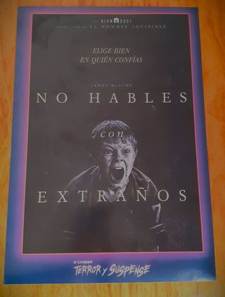 Póster de la película No Hables con Extraños producida, por Blumhouse. Dimensiones aproximadas de 50x35 cms. En buen estado. - Elige bien en quién confías. - Protagonizada por James McAvoy.