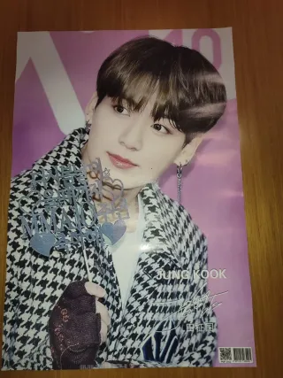 Póster del artista Jung Kook, miembro del grupo BTS. Presenta un diseño con un patrón de cuadros en blanco y negro en la vestimenta del artista. - Diseño con patrón de cuadros. - Imagen de Jung Kook.