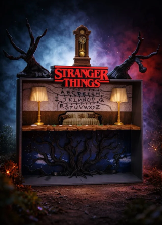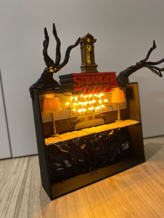 Expositor temático de Stranger Things, ideal para colecciones de figuras Funko Pop de Kinder Joy. - Diseño inspirado en la serie. - Espacio para figuras. - Incluye elementos decorativos como el reloj y las lámparas. Palabras: stranger things, funko, funko pop, kinder joy, will, upside down, hawkins,eleven, netflix, serie,friki, 3d,bambu lab, pokemon, apple