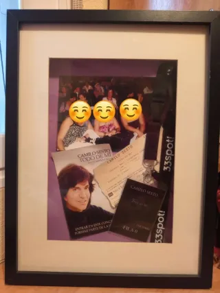 Colección de recuerdos de un concierto de Camilo Sesto. Incluye: - Fotografía. - Entrada del concierto del día 1 de octubre. del 2010, penúltimo concierto de Camilo en Madrid. - Colgante con pase fila 0. - Marco negro con paspartú blanco.