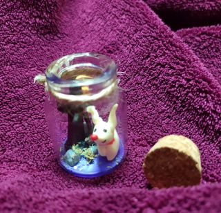 Botella del personaje Zero de la película "Pesadilla antes de Navidad" de Tim Burton. La botella mide 4,5cm de alto y 2.5cm de diámetro. El diorama está compuesto del personaje Zero hecho en arcilla polimérica, una cruz de madera con una calabaza, y una base con ramitas y piedras. (Puedes consultar el precio de las botellas personalizadas en la publicación de precios de mi perfil)