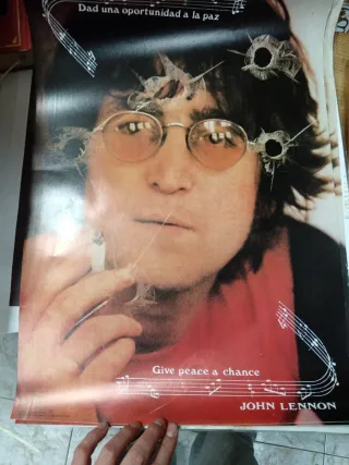 Póster icónico de John Lennon con la frase Da una oportunidad a la paz y Give peace a chance. - Diseño con notas musicales. - Imagen de John Lennon con gafas.