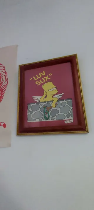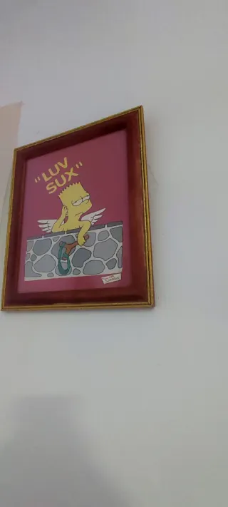Cuadro decorativo con Bart Simpson como Cupido. - Marco de madera con detalles dorados. - Fondo rosa. - Ilustración de Bart Simpson con alas y texto Luv Sux.