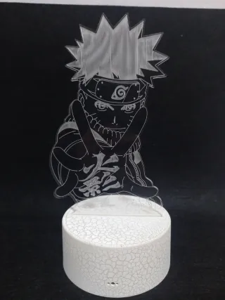 Lámpara decorativa con diseño de Naruto. - Base blanca con acabado agrietado. - Figura de acrílico grabada con láser. - Funciona conectando el cable o también con pilas. + Dos pósteres pequeños y unos cromos