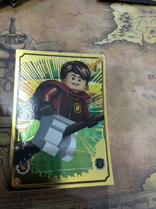 Carta coleccionable de Harry Potter con personaje de Lego. - Diseño de Ron Weasley. - Marco dorado y detalles holográficos. - Incluye emblemas de las casas de Hogwarts.