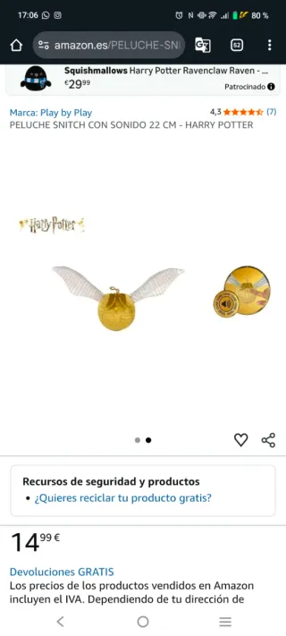 Peluche de la Snitch Dorada de Harry Potter. Un detalle icónico para los fans. Con sonido. - Diseño fiel al de las películas. - Material de felpa suave.