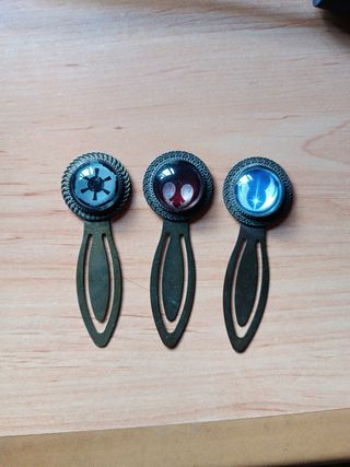 Marcapáginas de Star Wars en metal y cristal. Preciosos. Son muy elegantes para marcar las páginas de los libros que lees. Los vendo todos en pack por 13€.