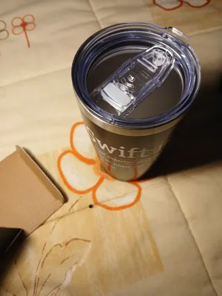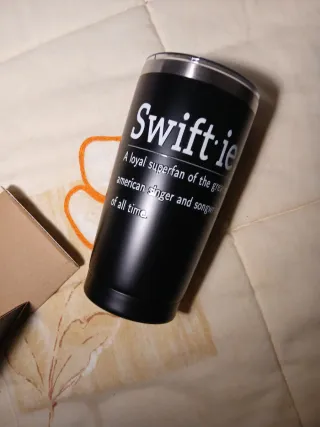 Vaso térmico negro con diseño inspirado en Taylor Swift. - Swiftie - A loyal superfan of the great american singer and songwriter of all time. - Tapa metálica plateada.