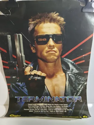 Póster original de la icónica película Terminator, del año 1984. Tiene un par de rotos pero no bien - Presenta a Arnold Schwarzenegger como el T-800. - Diseño clásico del cartel de cine. - Incluye créditos de producción y reparto.