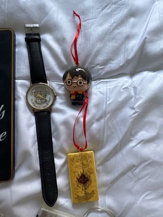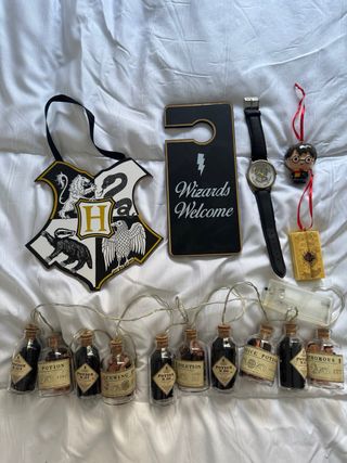 Conjunto de artículos de merchandising de Harry Potter. - Escudo decorativo de Hogwarts. - Cartel decorativo Wizards Welcome. - Reloj con correa negra. - Colgante de Harry Potter. - Colgante del mapa del merodeador. - Cadena de luces con botellas de pociones.