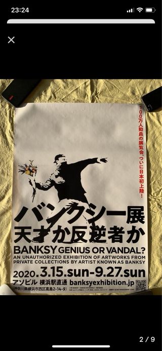 Cartel de la exposición de Banksy en Yokohama (JP) 71x 52cm - Banksy Genius or Vandal? - An Unauthorized Exhibition of Artworks from Private Collections by Artist Known as Banksy - Fechas: 15.03.2020 - 27.09.2020 - Impresión Lomitada y No se vendió On Line En perfecto estado estado. También tengo obras de Obey, Mr. brainwash, Sinao,.....