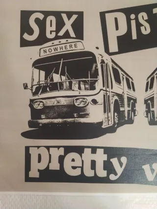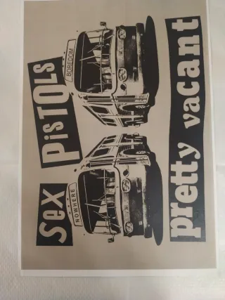 Tamaño 33x48cm Papel Verjurado Cartel icónico de los Sex Pistols con el diseño Pretty Vacant. - Diseño con autobuses y texto. - Sex Pistols en un lateral. - Pretty Vacant en el otro lateral.