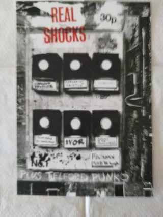 Tamaño 21x31cm Papel Verjurado Cartel promocional del fanzine Real Shocks - Diseño en blanco y negro con detalles en rojo. - Incluye imágenes de vinilos o discos. - Muestra nombres de artistas o canciones como IVOR y CAPTAIN SPARKLE. - Menciona PLUS TELFORD PUNKS.