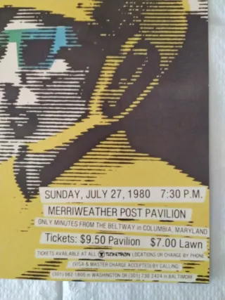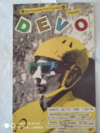 Tamaño 26x42cm Papel Nautilius 300gr Cartel del concierto de Devo en el Merriweather Post Pavilion. - Fecha: Domingo, 27 de julio de 1980. - Hora: 7:30 P.M. - Lugar: Merriweather Post Pavilion, Columbia, Maryland. - Precio de las entradas: $9.50 Pabellón, $7.00 Césped. - Aceptan Visa y Master Charge.