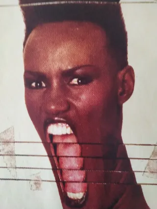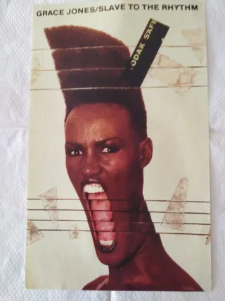 Tamaño 27x44cm Papel reciclado 90gr Cartel de Grace Jones del álbum Slave to the Rhythm. - Imagen icónica de la artista. - Diseño con elementos gráficos distintivos.