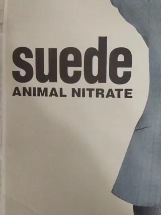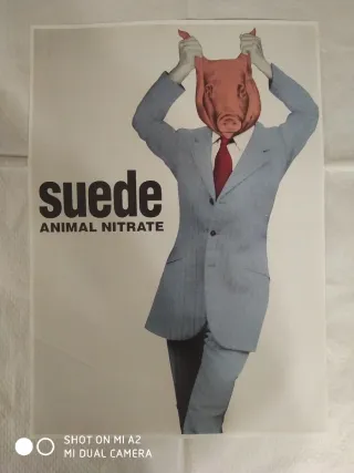Tamaño 32x45cm Papel Verjurado Cartel promocional del álbum Animal Nitrate de Suede. Presenta un diseño artístico distintivo. - Diseño con un hombre con traje y corbata, y una máscara de cerdo. - Texto suede y ANIMAL NITRATE claramente visible.