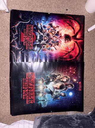 Conjunto de pósters de la popular serie Stranger Things. Incluye diseños de las temporadas 1, 2, 3 y 4. - Póster de la temporada 1. - Póster de la temporada 2. - Póster de la temporada 3. - Póster de la temporada 4.
