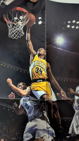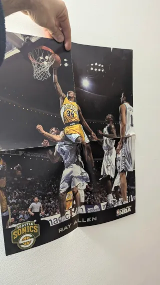 Póster del jugador de baloncesto Ray Allen con el equipo Seattle Sonics. - Incluye el logo de los Seattle Sonics. - Nombre del jugador: Ray Allen. - Número del jugador: 34. - Logo oficial de la NBA.