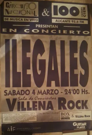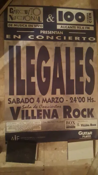 Cartel original del concierto de Ilegales en la Sala de Conciertos Villena Rock. - Fecha: Sábado 4 de Marzo. - Hora: 24:00 Hs. - Presentado por Circuito Nacional & Cadena Cien Alicante 95.6 FM. - Producción: Box Music & Villena Rock. - Dirección: Ctra. Biar Km. 1 Villena.