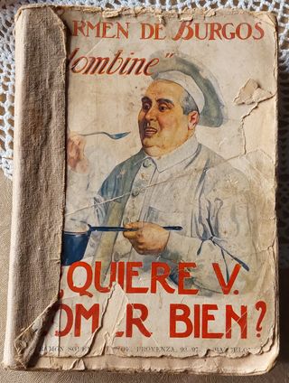 Antiguo libro "¿Quiere usted comer bien? Manual práctico de cocina" de Carmen de Burgos (Colombine) Libro de 1949 Evidentes signos de uso pero el interior está bastante bien conservado