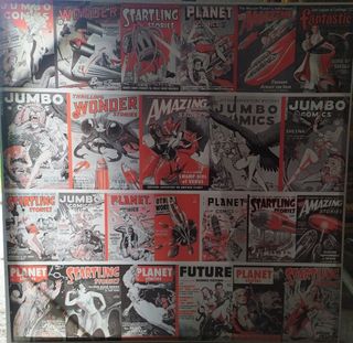 Cuadro mosaico con portadas de revistas de ciencia ficción de los años 30-40. Muy chulo para amantes de cómics, ciencia ficción... Está nuevo. Mide 1 metro x 1 metro.