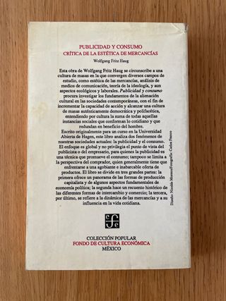 Esta obra de Wolfgang Fritz Haug se circunscribe a una cultura de masas en la que convergen diversos campos de estudio, como estética de las mercancías, análisis de medios de comunicación, teoría de la ideología, y aun aspectos ecológicos y laborales. Publicidad y consumo procura investigar los fundamentos de la alienación cultural en las sociedades contemporáneas, con el fin de incrementar la capacidad de acción y alcanzar una cultura de masas auténticamente democrática y polifacética, entendiendo por cultura la suma de todas aquellas instancias sociales que conforman lo cotidiano y que redundan en beneficio del hombre.
