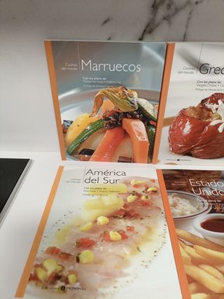 Cuatro libros de cocina con recetas e ilustraciones a todo color. Especifica los ingredientes para cada receta, el número de personas, el grado de dificultad, y el tiempo de preparación de cada una de ellas Tapas duras. Nuevos. Estado impecable. 15 € los cuatro juntos.