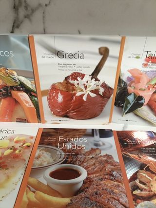 8 libros de recetas Cocina El País, tamaño 15x16 cm. en español, tapas duras. 70 páginas. Distintos alimentos con recetas y explicaciones de cómo elaborarlos. Los ocho por 6 €