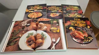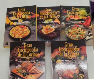 Gran Enciclopedia de la Cocina formada por 5 libros que abarca todo tipo de platos y recetas: entrantes, sopas, legumbres, verduras, pastas, salsas, carnes, pescados, repostería, vinos, etc Recetas de la Academia de Cocina Española. Con muchas fotos y todo tipo de explicaciones. Muy útil para cualquier persona.
