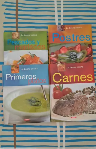 Colección 4 libros de cocina. La buena cocina. Primeros platos, carnes, pescado y postres. Con recetas, preparación e ilustraciones. Completamente nuevo
