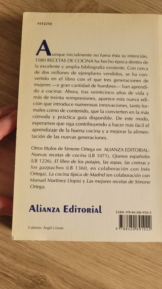 el libro de cocina "1080 Recetas de Cocina" de Simone Ortega, publicado por Alianza Editorial. Es un clásico indispensable de la gastronomía española. Autor: Simone Ortega, una figura señera en el panorama culinario español. Contenido: Un recetario clásico que ha enseñado a cocinar a varias generaciones. Popularidad: Se han vendido más de 3 millones de ejemplares en las décadas que lleva en el mercado. Editorial: Alianza Editorial.