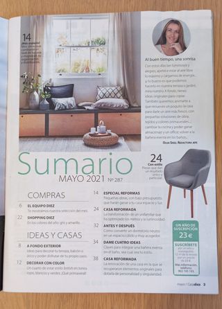 3 revistas de decoración de interiores: "Ideas y tendencias interiores" (número 239) + "Nuevo estilo" (número 513) + "Casa diez" (número 287). Todas ellas son de mayo de 2021. Están en muy buen estado por no haber sido apenas usadas. En las fotos tenéis el catálogo y los precios originales.