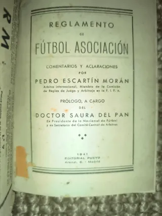 Reglamento de Fútbol comentado por Pedro Escartín (1941) Madrid. Contiene datos sobre la historia del fútbol español. Libro de coleccionista. Vintage. 288 págs