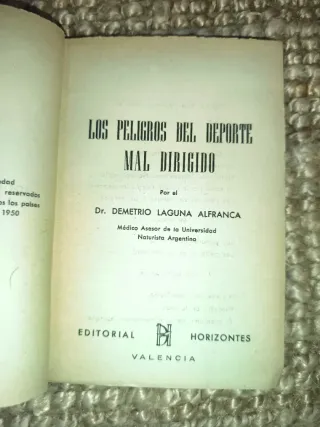 LOS PELIGROS DEL DEPORTE MAL DIRIGIDO Por el Dr. DEMETRIO LAGUNA ALFRANCA Médico Asesor de la Universidad Naturista Argentina EDITORIAL HORIZONTES VALENCIA, 1950. Fútbol, natación, ciclismo ... libro raro