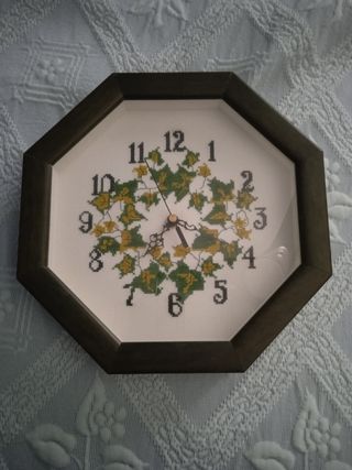 Reloj de punto de cruz con el marco verde oscuro. Funciona con una pila AA. En muy buen estado, sólo se ha despegado un poco la parte de atrás, pero se puede pegar, cambiar o poner otro encima.