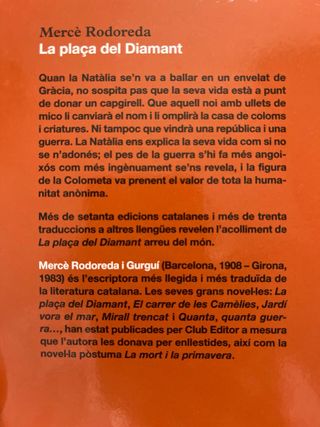 Quan la Natàlia se'n va a ballar en un envelat de Gracia, no sospita pas que la seva vida està a punt de donar un capgirell. Que aquell noi amb ullets de mico li canviarà el nom i li omplirà la casa de coloms i criatures. Ni tampoc que vindrà una república i una guerra. La Natàlia ens explica la seva vida com si no se n'adonés; el pes de la guerra s'hi fa més angoi-xós com més ingènuament se'ns revela, i la figura de la Colometa va prenent el valor de tota la huma-nitat anònima. Més de setanta edicions catalanes i més de trenta traduccions a altres llengües revelen l'acolliment de La plaça del Diamant arreu del món.