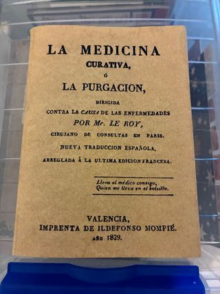 Libro antiguo de gran valor, dando a conocer la purgación como medicina curativa, dirigida contra las enfermedades. Mr. Le Roy. Traducción de la edición francesa. 1829. Contenido de 451 páginas.