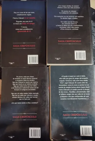PRECIO NEGOCIABLE Vendo la saga completa de Crepúsculo de Stephenie Meyer (4 libros). Incluye los 4 títulos originales de la historia de Bella y Edward. Libros en buen estado, cuidados y listos para una nueva lectura. 📚 También se venden por separado. Ideal para fans de la saga o para quien quiera tener la colección completa sin pagar precio de tienda. Entrega en mano o envío por la app. Respondo rápido ✨