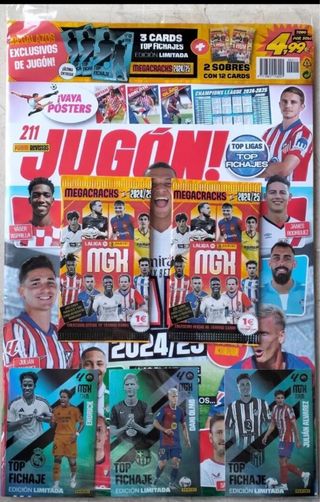 Revista de Panini Jugón Número 211. En su envoltorio original con dos sobres de 6 cromos cada uno total 12 cromos. 3 Cromos edición limitada Dani Olmo, Endrick y Julián Álvarez.