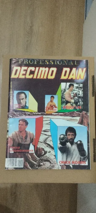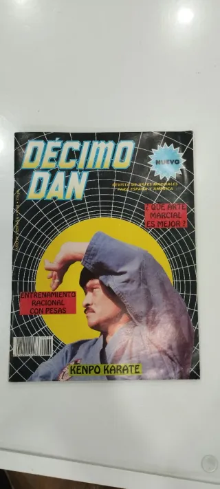 Lote de 2 revistas clásicas de artes marciales Décimo Dan en buen estado. Nº 8: Incluye reportaje especial de Bruce Lee, Chuck Norris y Schwarzenegger. Nº 34: Especial Kenpo Karate y entrenamiento con pesas. Ambas incluyen la mítica contraportada de la tienda Bokken con catálogo de armas de la época. Ideal para coleccionistas vintage.