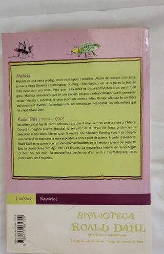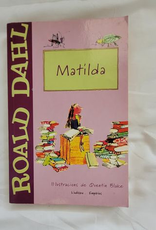 Autor: Roald Dahl. Ilustrador: Quentin Blake. Editorial de esta edición: Editorial Empúries. Sinopsis: La historia sigue a Matilda, una niña extremadamente inteligente y con poderes telequinéticos que vive con unos padres que no la valoran y debe enfrentarse a la tiránica directora de su escuela, la señorita Trunchbull. Género: Novela infantil de fantasía que sigue a una niña genio con poderes telequinéticos. Temas: Amor por la lectura, superación de la injusticia y la búsqueda de afecto paternal. Idioma: catalán.