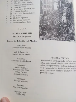 Revistas del barrio de Triana de 1986 (libro de la izquierda) y 1990 de la Vela de Santiago y Seña de Santa Ana (el de la derecha) de la imprenta municipal de Sevilla, sobre la historia y folclore del barrio, bastante bien conservados. Precios por cada uno: -El de la izquierda: 10€ -El de la derecha: 2 € Triana Semana Santa Pasos Pasión Coleccionismo Colección Antigüedades Arte Religión Santos Cofradías Procesiones Revistas Tomos Fascículos Boletines Anuarios Imágenes