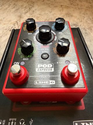 Procesador de efectos y amplificador Line 6 POD Express. Como nuevo, apenas lo use para probarlo, muy sencillo y efectivo. - Controles de Boost, Gain, Distortion, Fuzz. - Controles de Chorus, Flanger, Mod, Mid. - Controles de Delay, Bass, Analog, Pong. - Controles de Reverb, Treble, Hall, Plate, Spring, Space. - Botones Amp, Ch. Vol, Save, Alt. - Pedales de expresión y tap tempo.