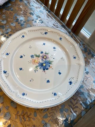 Conjunto de tres platos de estilo vintage con un delicado diseño floral. - Diseño floral inspirado en los años 90. - Borde con detalles en azul claro.