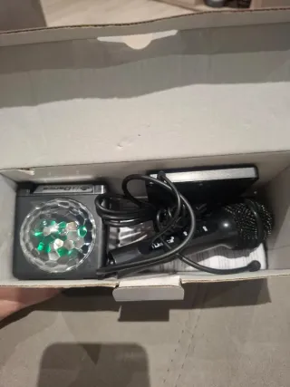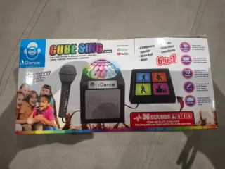 Altavoz dance cubo sing con bola de luces y micrófono Karaoke y Almohadillas de sonido - Luces LED de colores. - Micrófono con cable.