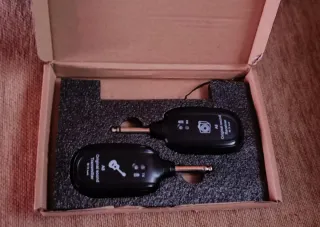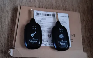 Sistema inalámbrico para guitarra A8, compuesto por transmisor (TX) y receptor (RX). Diseñado para ofrecer un sonido original. - Transmisor (TX) con icono de guitarra. - Receptor (RX) con icono de cámara. - Voltaje de 3.7V. - Fabricado por WENTELMICRO ELECTRONIC CO., LTD.